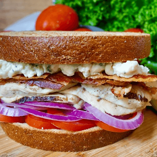 Sliced grilled chicken breast, blue cheese, tomato, bacon, red onion, mayo
