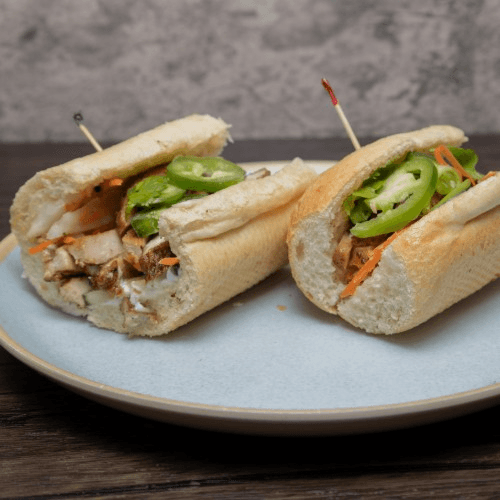 Teriyaki chicken, pickled daikon & carrots, jalapeño, cucumber, cilantro, mayo