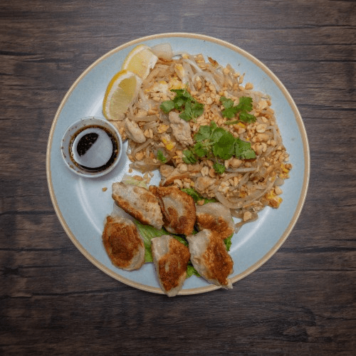 Serve with peanuts, cilantro & slice of lemon and a side of housemade dumpling sauce